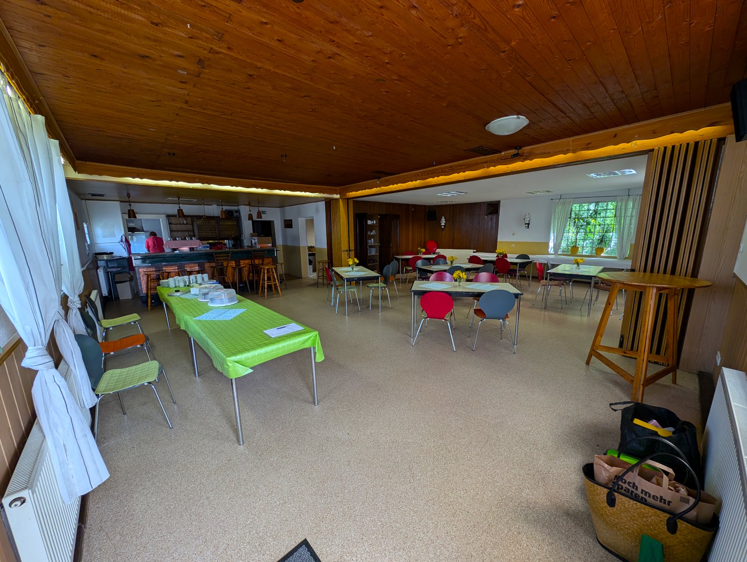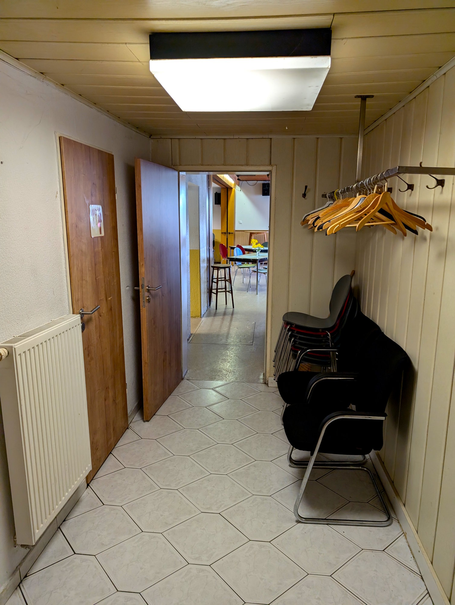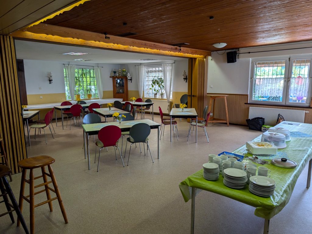 Auf dieser Seite kannst du dir unser Vereinsheim von innen anschauen. Neben Tischen und Stühlen verfügt das Vereinsheim ebenfalls über eine eigene Küche, WCs, eine Garderobe sowie einen Nebenraum.