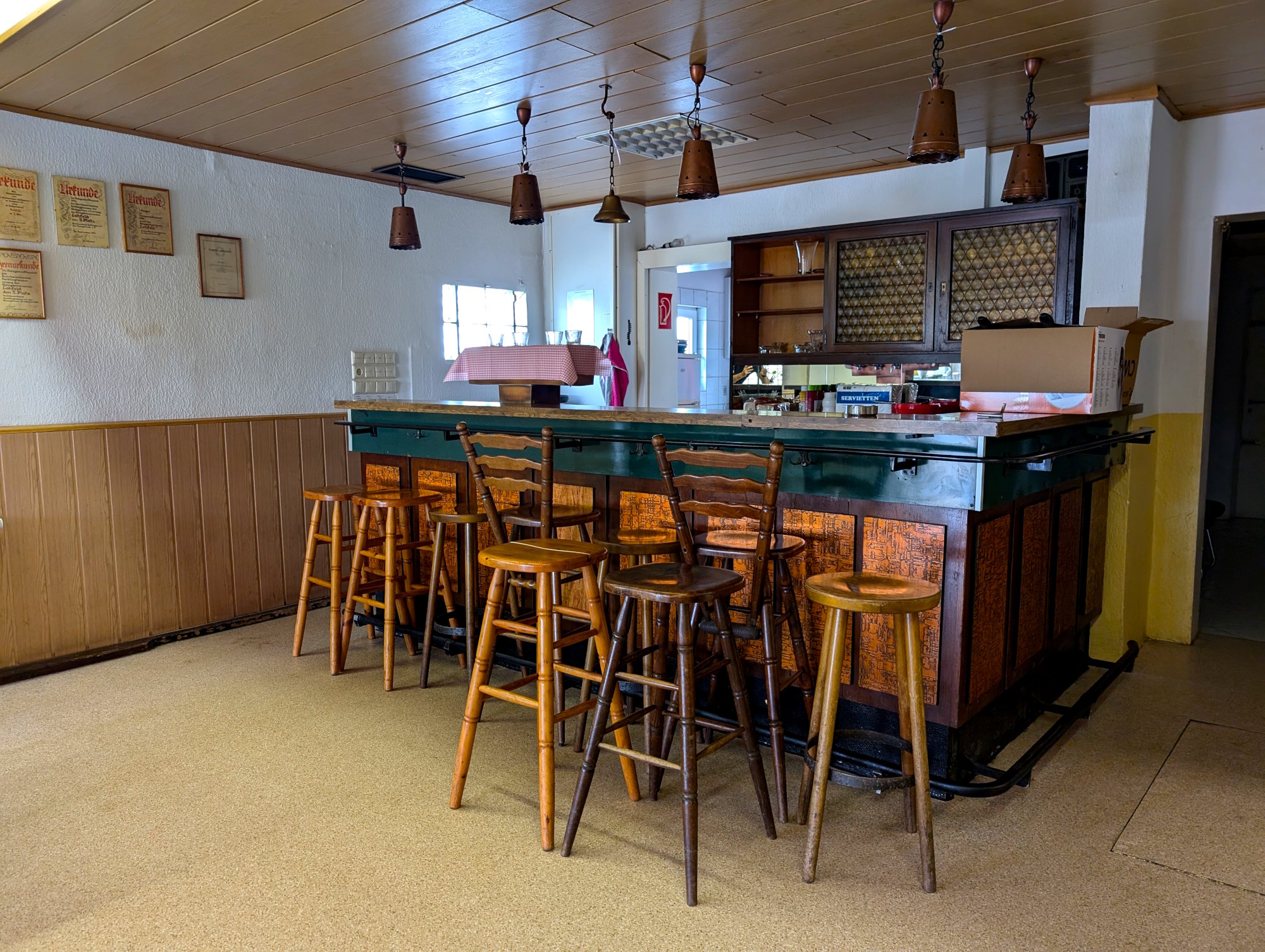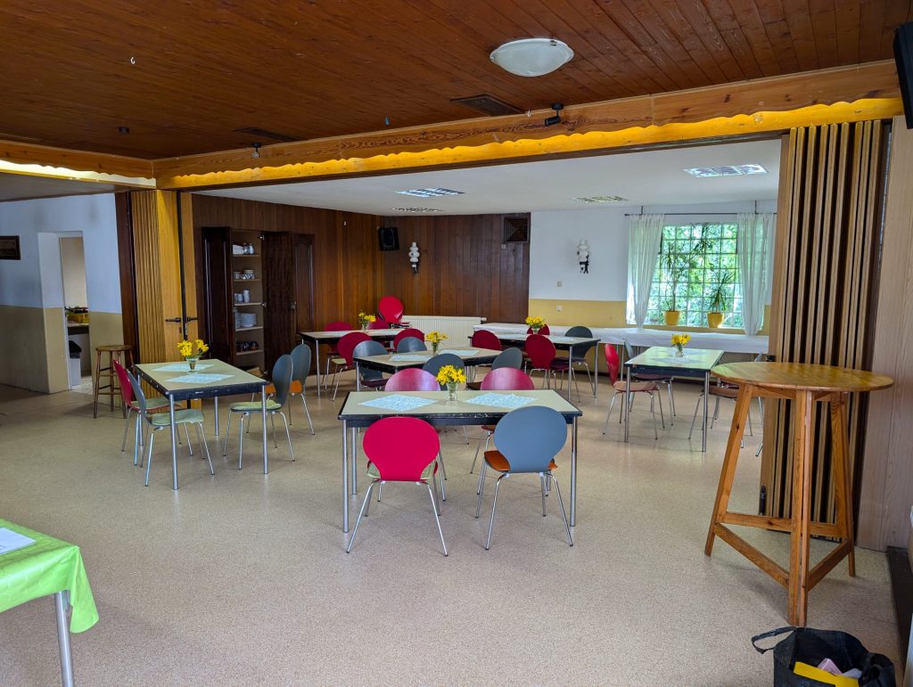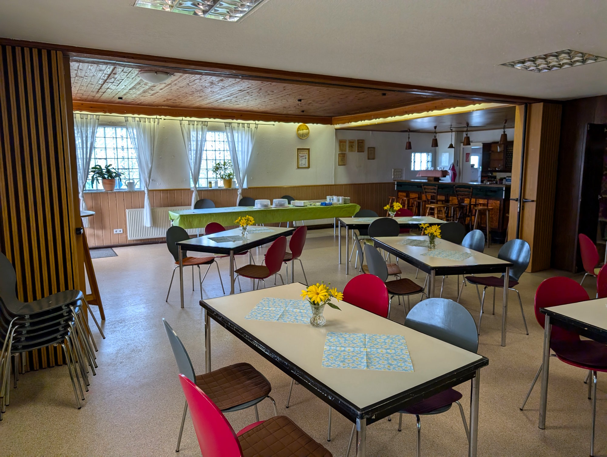 Auf dieser Seite kannst du dir unser Vereinsheim von innen anschauen. Neben Tischen und Stühlen verfügt das Vereinsheim ebenfalls über eine eigene Küche, WCs, eine Garderobe sowie einen Nebenraum.